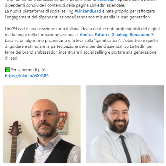 Questa intervista è stata pubblicata su Startup News il 2 giugno 2021 Arriva Link&Lead, la startup che trasforma i dipendenti in brand ambassador Link&Lead ha sviluppato un algoritmo proprietario per monitorare, in modo automatico la comunicazione dei dipendenti su LinkedIn Per fare una comunicazione digitale d’impresa davvero efficace – a scopo di marketing, recruiting e vendite – serve la partecipazione online dei dipendenti. Ma questi non contribuiscono (quasi) mai: secondo una statistica di LinkedIn, solo il 2% dei dipendenti condivide contenuti della pagina della propria azienda. Un vero peccato: se lo facessero, si amplierebbe di 10 volte il network potenziale;…