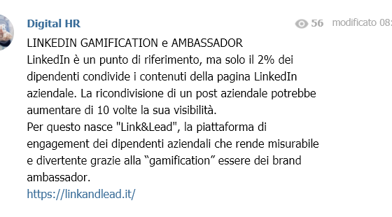 “Le potenzialità di LinkedIn per le aziende sono testimoniate dai numeri, eppure solo il 2% dei dipendenti condivide i contenuti della pagina LinkedIn aziendale. Se si pensa che grazie ai loro network personali una ricondivisione di un post aziendale potrebbe aumentare di 10 volte la sua visibilità (dati LinkedIn), è chiaro che siamo di fronte a delle opportunità perse. Da questa premessa è nata Link&Lead, la nuova piattaforma di engagement dei dipendenti aziendali che rende misurabile e divertente la lead generation”. Leggi tutto l’articolo