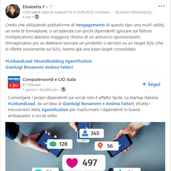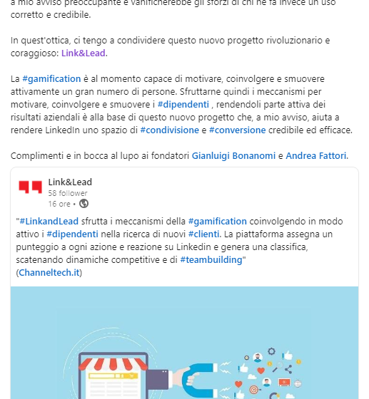Contentfirst.it, portale creato da professionisti della scrittura, ha dedicato nel giugno del 2021 uno speciale al tema della gamification. Vi era spiegato che cosa si intende per gamification, come farla e sono stati citati alcuni esempi concreti. Tra un M&Ms e Foursquare, si cita anche il nostro caso. Con queste parole: Il caso di Link&LeadL’ultimo esempio di Gamification che ti faccio riguarda un caso recente e 100% Made in Italy. Si tratta di Link&Lead, interessante startup che ha implementato un sistema di gamification per trasformare (di propria volontà, non preoccuparti!) i dipendenti in social ambassador, nello specifico su LinkedIn, il social…