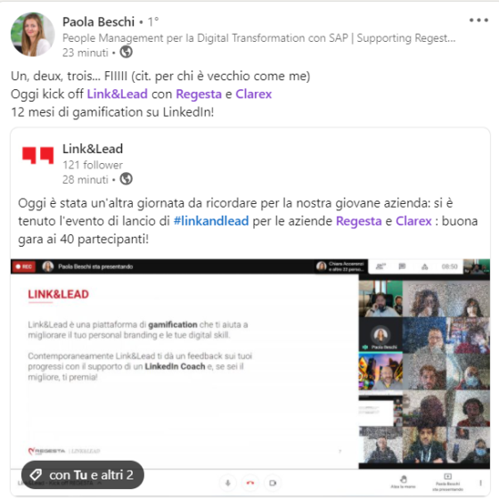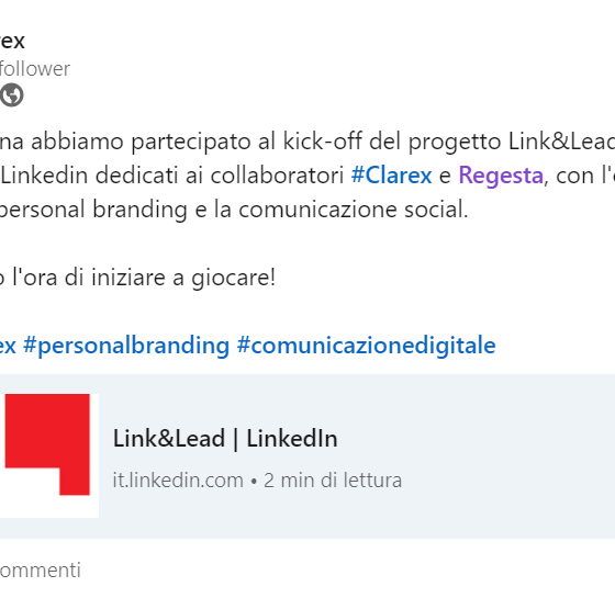 Questo articolo è stato pubblicato su Villaggio Tecnologico il 18 febbraio 2022. Regesta è un’importante azienda bresciana, una società di consulenza informatica che da anni si occupa di trasformazione digitale e, nello specifico, di implementazione delle soluzioni SAP. Regesta ha oltre 160 collaboratori e, nel 2021, i team marketing e HR dell’azienda hanno deciso di sperimentare Link&Lead. Gli obiettivi erano tre: Rafforzare le skill di digital communication dei collaboratori per trasformarli in brand ambassador Potenziare, lato marcom, la comunicazione digitale e, lato HR, l’employer branding Aumentare il numero di follower della pagina (potenziali lead) L’organizzazione del gioco All’inizio del progetto, nell’estate del 2021, sono stati coinvolti 36 collaboratori. Un…
