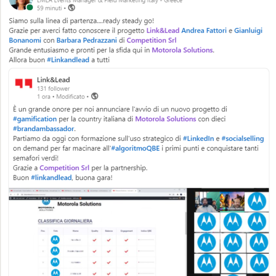 “I dati relativi alle attività su LinkedIn delle persone coinvolte nel progetto vengono raccolti in parte automaticamente e in parte tramite gli analisti di Link&Lead. L’algoritmo QBE proprietario elabora i dati e restituisce una classifica del posizionamento dei dipendenti, che mostra chi sta applicando in modo più corretto le indicazioni fornite durante la formazione. La classifica indica anche a ciascun partecipante il livello raggiunto nelle tre componenti basilari dell’algoritmo QBE: quality, balance, engagement.” (Villaggio Tecnologico) Leggi tutto l’articolo